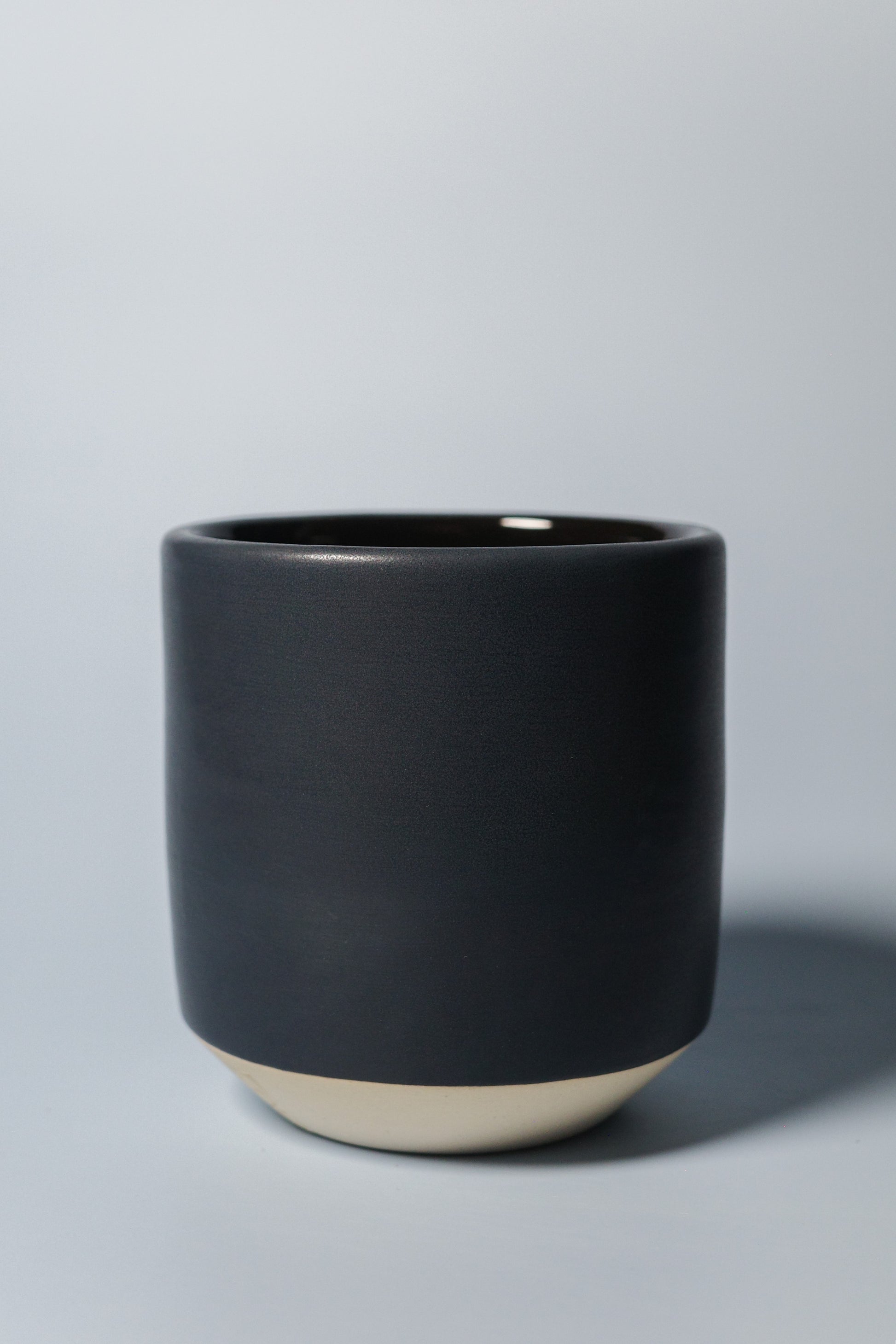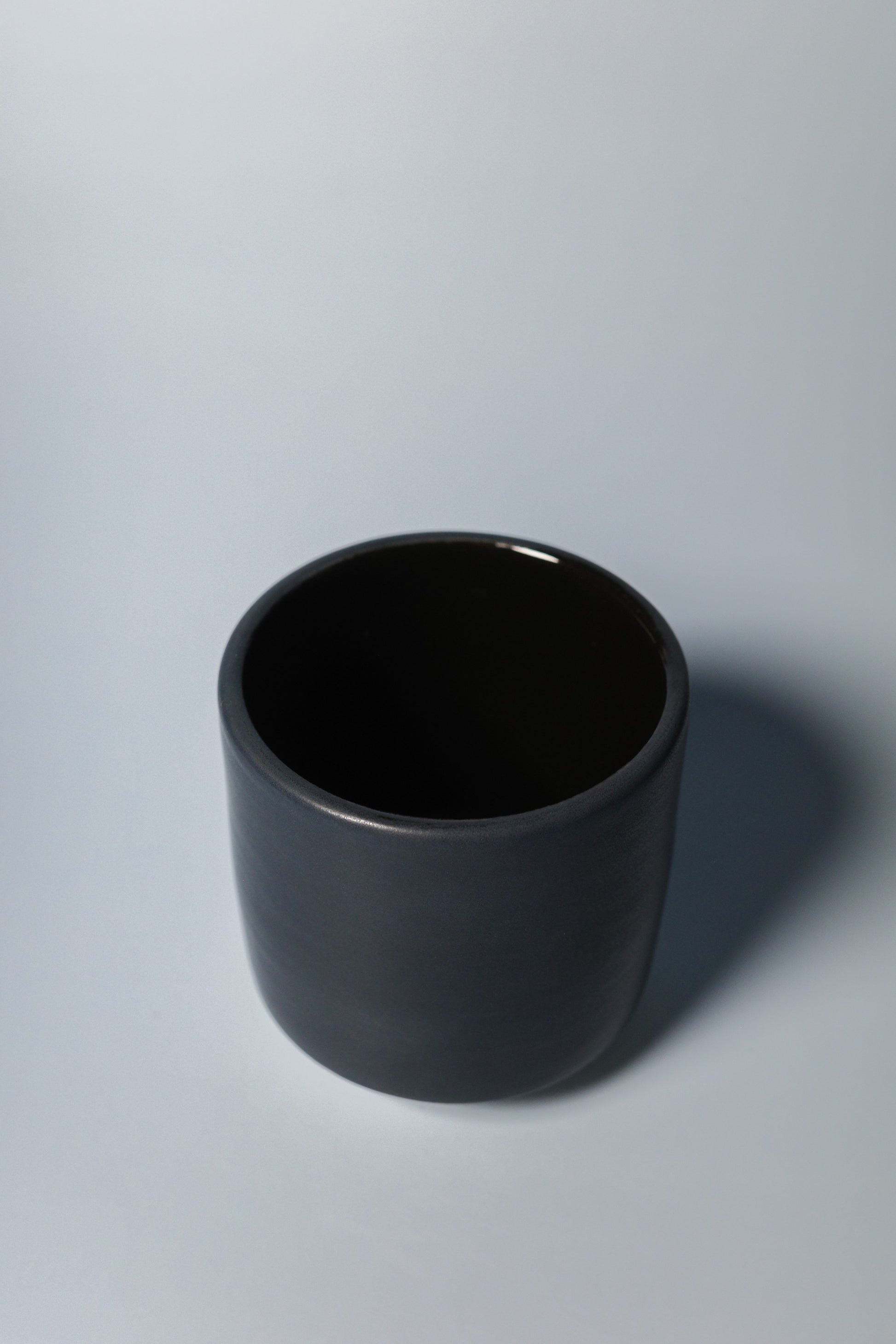 A cool black cup featuring a matte exterior and a glossy interior.